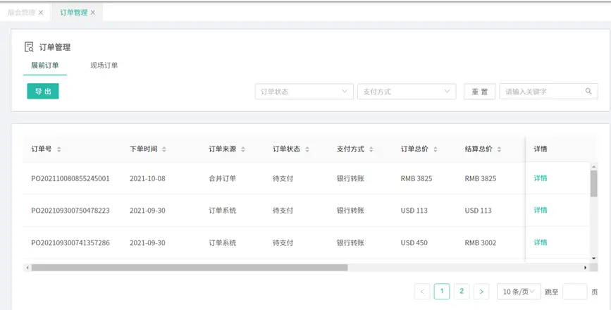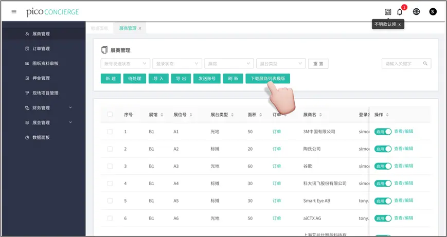 展商管理:導入參展商數據、新建展商、啟用禁用展商、導出展商信息