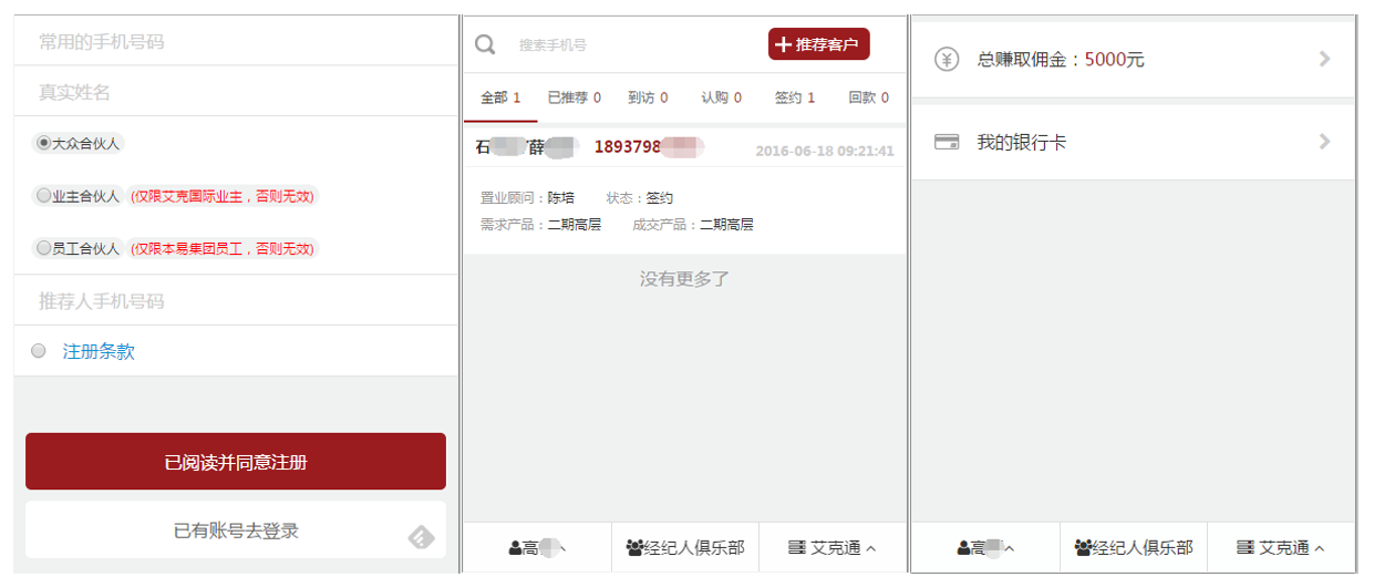 客戶(hù)注冊:擁有微信并關(guān)注公眾號,即可注冊申請成為全民營(yíng)銷(xiāo)系統的用戶(hù)(全民經(jīng)紀人)。注冊用戶(hù)可隨時(shí)通過(guò)微信查看已經(jīng)推薦的客戶(hù)信息、購房進(jìn)度、傭金結算情況。