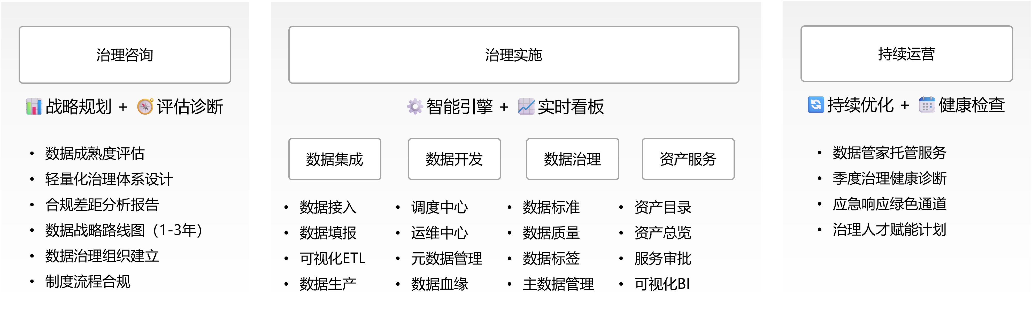 數據治理服務(wù)流程圖“樞理”從戰略高度出發(fā),開(kāi)展數據治理咨詢(xún)。通過(guò)數據成熟度評估,精準診斷企業(yè)數據管理現狀;設計輕量化治理體系,適配企業(yè)規模與業(yè)務(wù)特性;出具合規差距分析報告,保障數據管理符合行業(yè)規范。同時(shí),繪制1 - 3年數據戰略路線(xiàn)圖,明確長(cháng)期治理方向;協(xié)助建立數據治理組織,厘清職責分工;規范制度流程,讓數據治理“有章可循”,為后續治理筑牢頂層設計基礎 。